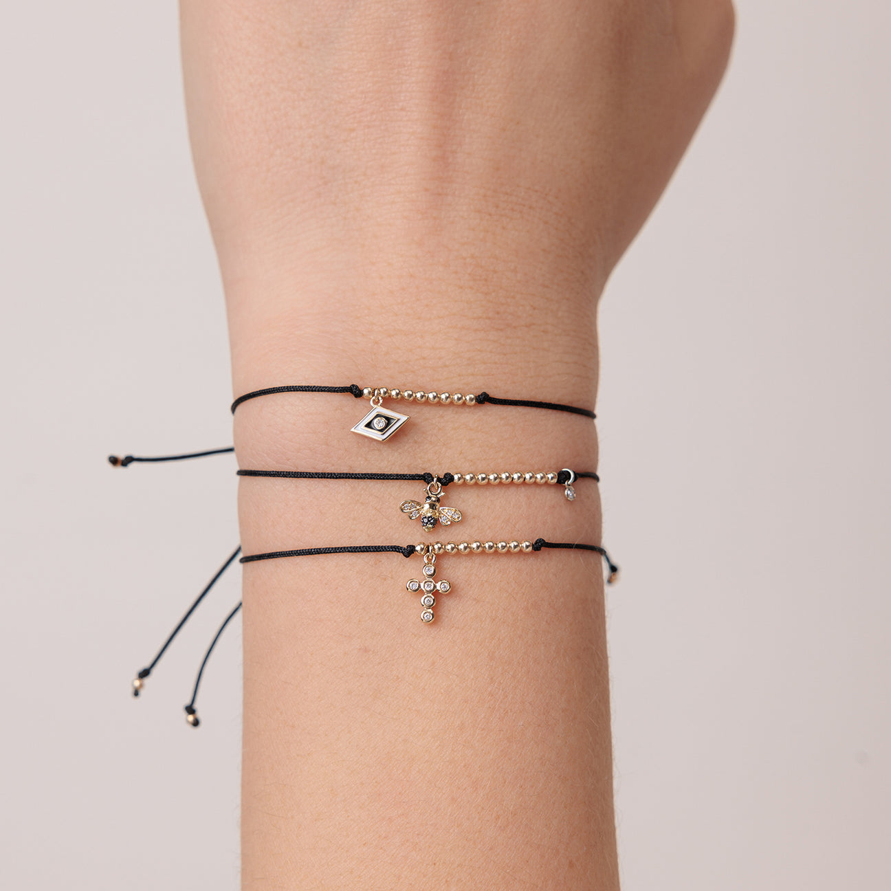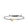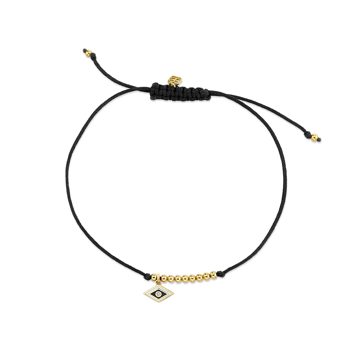This sleek bracelet features a black silk cord accented with 14k yellow gold round beads. At its center is a 14k yellow gold charm designed as a tiny black enamel groovy eye, enhanced with a bezel-set diamond. The combination of striking black enamel and sparkling diamond adds a touch of sophistication and edge to this stylish piece.