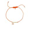 This vibrant bracelet features an orange silk cord embellished with 14k yellow gold round beads. The centerpiece is a 14k yellow gold charm shaped as a tiny orange enamel groovy eye, adorned with a bezel-set diamond. The blend of bold enamel and sparkling diamond adds a playful and elegant touch to this distinctive piece.