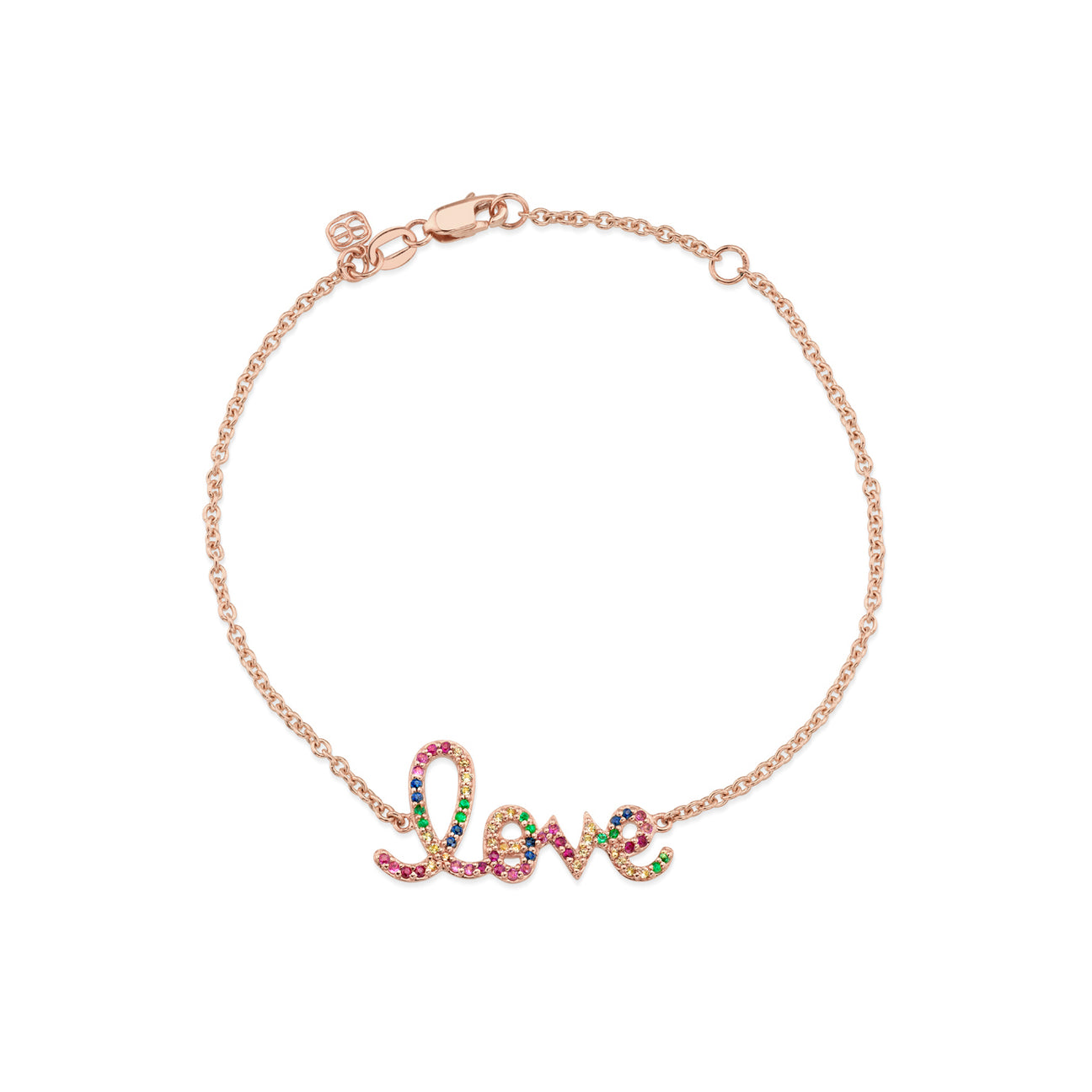 Celebrate love in vibrant style with this medium 14k gold bracelet featuring the word “love” beautifully spelled out in our exclusive SE hand-drawn script. The “love” charm, measuring approximately 7/8″ across, is adorned with a dazzling pavé rainbow of gemstones that catch the light with every movement. The full bracelet length is approximately 6.75″, designed for a comfortable, elegant fit.