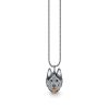 This necklace features a striking black rhodium Husky dog charm, symbolizing loyalty, strength, and resilience. The charm is delicately adorned with diamonds, representing purity and brilliance, while its captivating blue sapphire eyes evoke the clarity and depth of wisdom. Measuring approximately 5/8″ high by 1/2″ wide, the charm hangs gracefully from a fine cable chain, which adjusts from 16″ to 18″ with an extender, offering both elegance and versatility. The design seamlessly blends sophistication with a playful spirit, capturing the enduring bond between the wearer and their own inner strength.