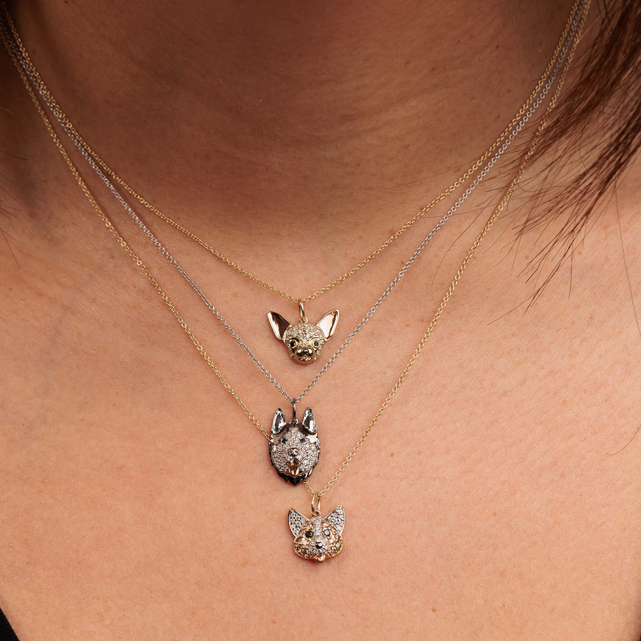 This charming necklace features a 14k yellow gold Chihuahua dog charm, adorned with sparkling diamonds and black diamond eyes. The charm measures approximately 1/2″ in height and 5/8″ in width, adding a playful yet elegant touch. It is gracefully suspended from a fine 14k gold cable chain, measuring 16″ in length with an extender at 18″ for a versatile fit.