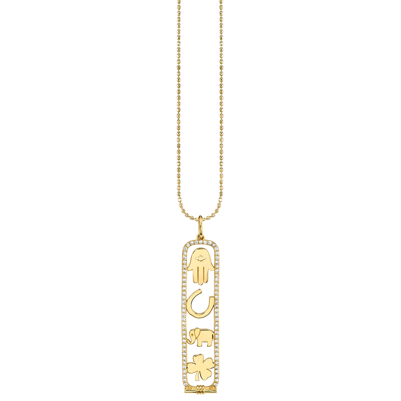 Embodying powerful symbols of luck, protection, and wisdom, this stunning 14k yellow gold and diamond cartouche charm necklace features four iconic motifs: a pure gold Hamsa, horseshoe, elephant, and shamrock clover. Each symbol is thoughtfully integrated into a sleek cartouche design, accented with brilliant pavé diamonds for a radiant finish.