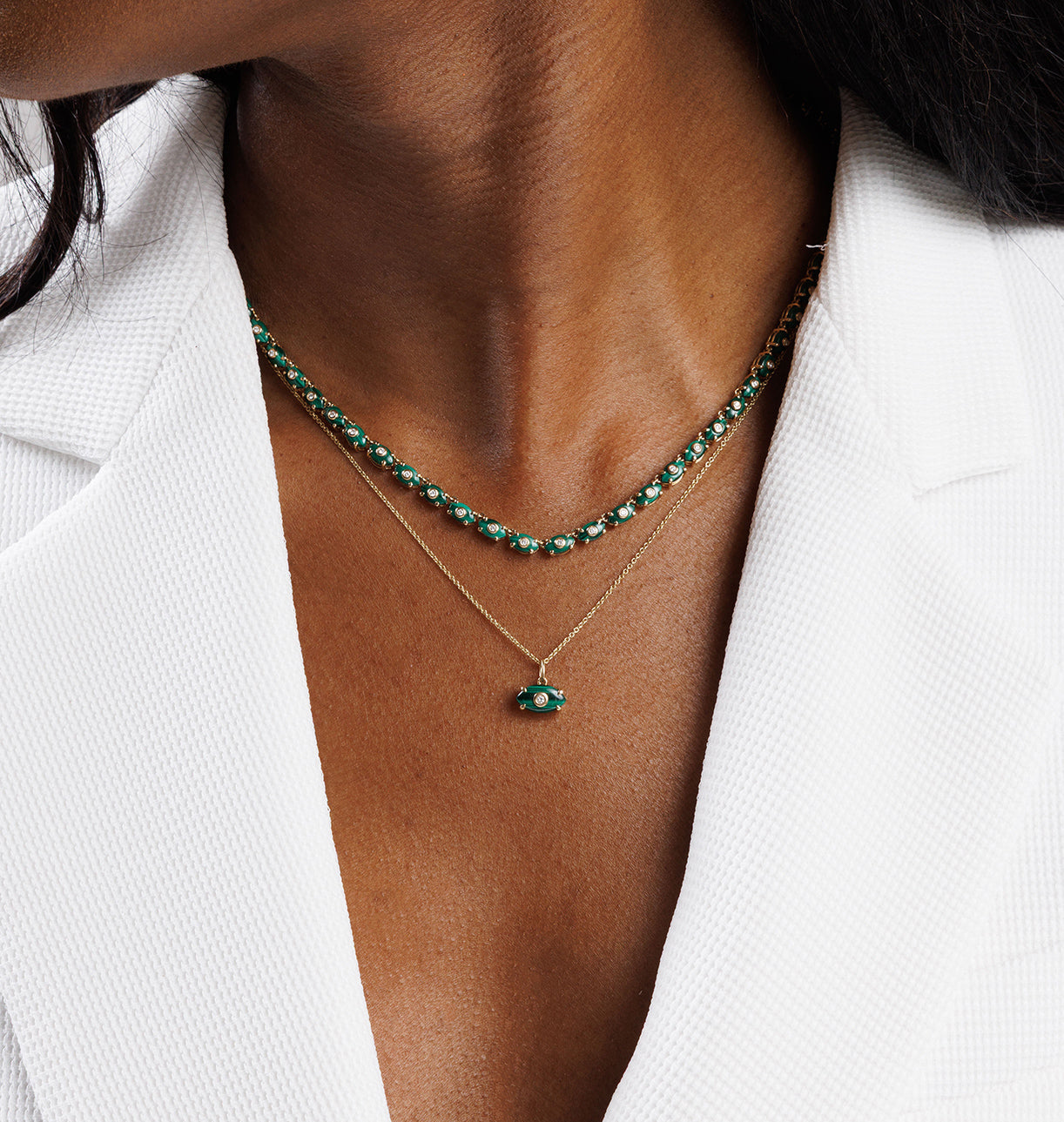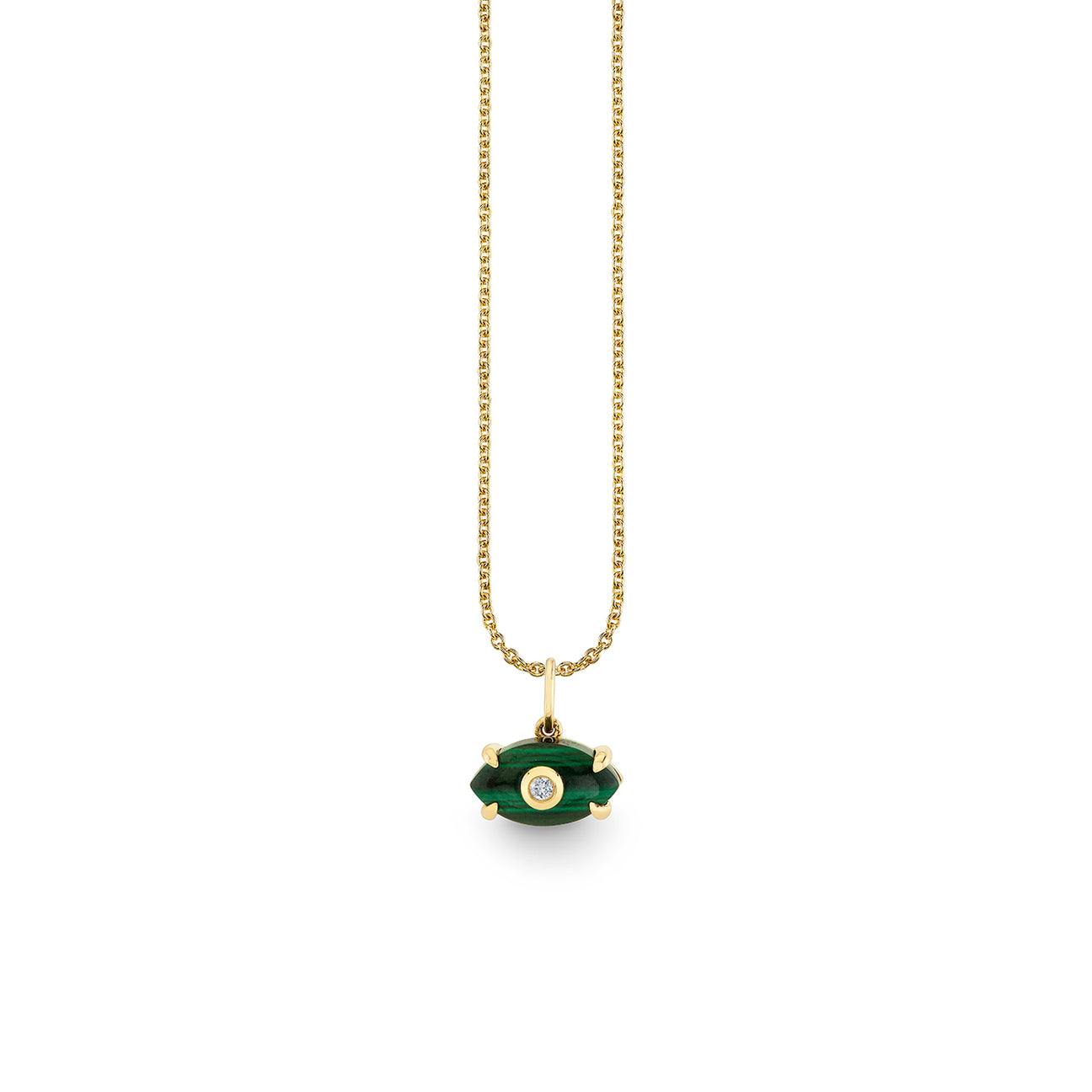 Crafted from 14k gold, the Medium Carved Stone Bezel Eye Charm features a striking bezel eye shape with a vibrant malachite center and a sparkling diamond at its heart. The combination of rich green stone and brilliant diamond creates a piece that feels both protective and elegant, perfect for layering or wearing alone as a meaningful statement.