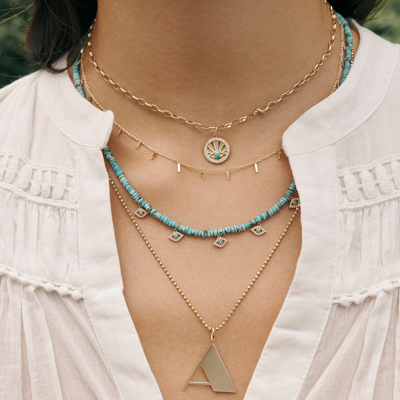 A powerful emblem of intuition and spiritual protection, this 14k yellow gold protective eye coin necklace features a radiant eye motif surrounded by engraved rays—symbolizing light, clarity, and guidance. At its center sits a vivid turquoise cabochon, long believed to offer calming energy and shield against negativity. A halo of pavé-set white diamonds adds a brilliant, eye-catching sparkle.