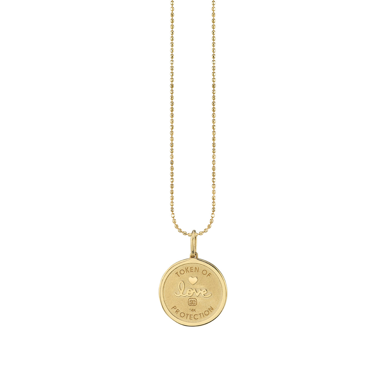Crafted in true coin style with two-sided detailing, the pendant measures approximately 1/2″ x 1/2″ and is suspended from a fine 14k gold 18″ ball chain for effortless, everyday wear.