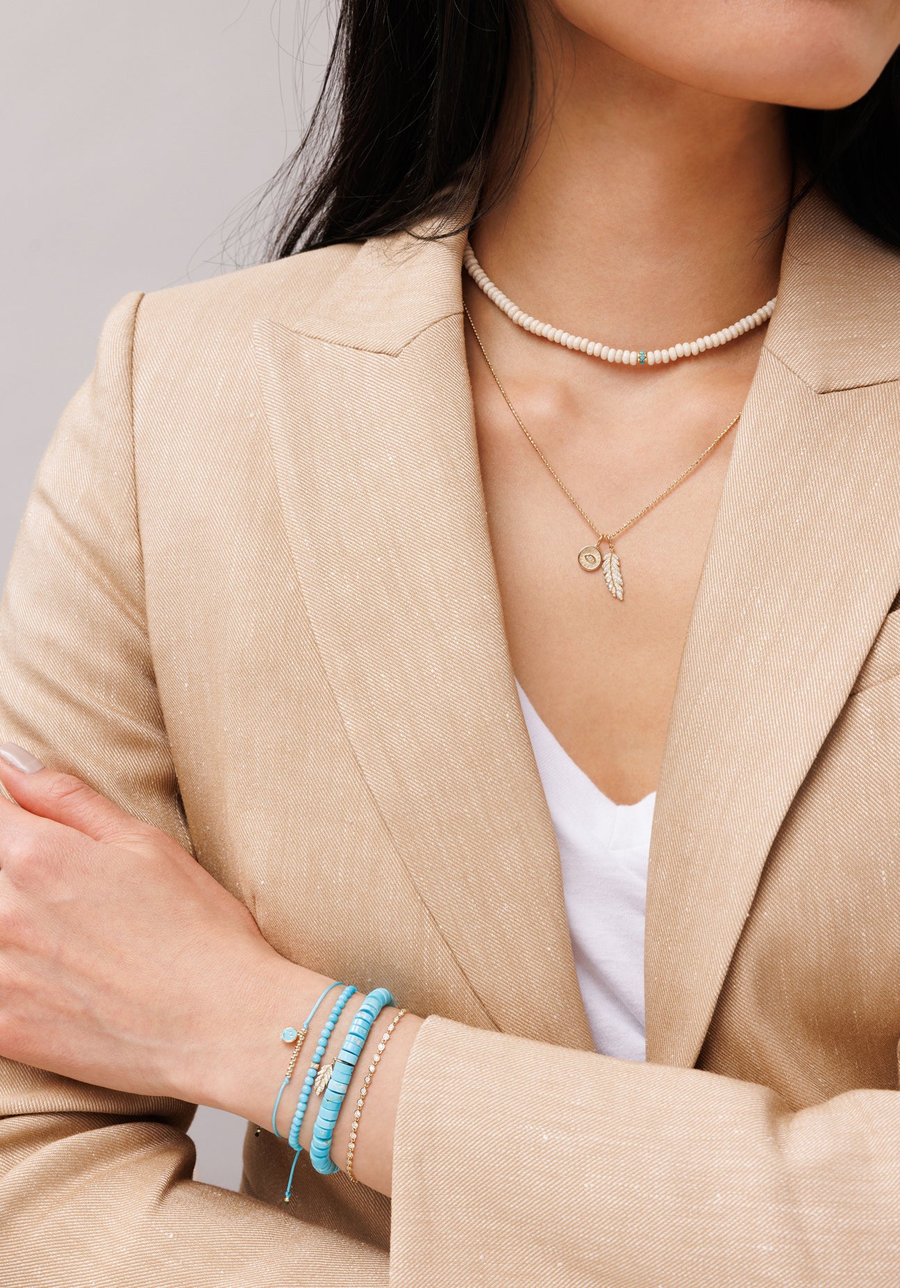 Crafted from 14k gold, this beaded bracelet features a 4mm scallop-edged pavé diamond rondelle adorned with turquoise stones, paired with smooth 4mm cream jasper rondelles. The soft neutral tones of jasper are elevated by the rich turquoise accents and subtle sparkle of diamonds. The choker measures 16.25″ in total length, including a 3.25″ chain extender.