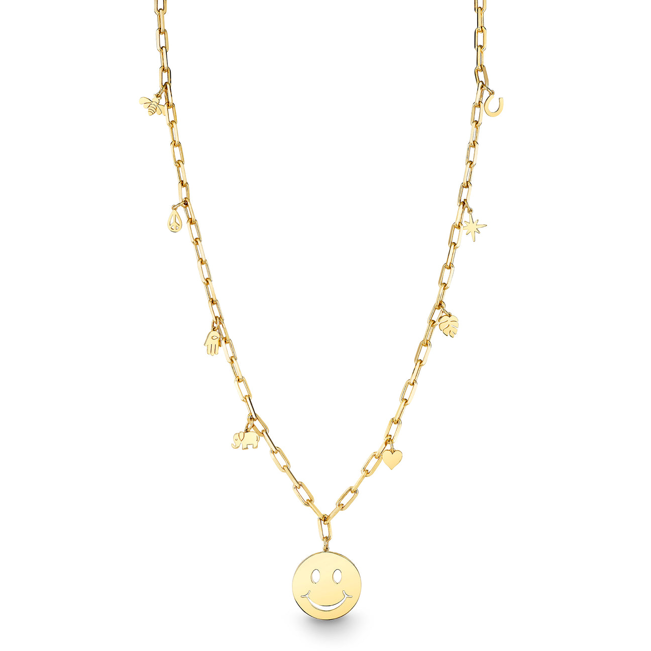 At the heart of this piece is a captivating large happy face charm, a universal emblem of joy and optimism, designed to bring a smile to your face every day. Surrounding it are an array of delicate, hand-soldered charms, each rich with its own symbolism: