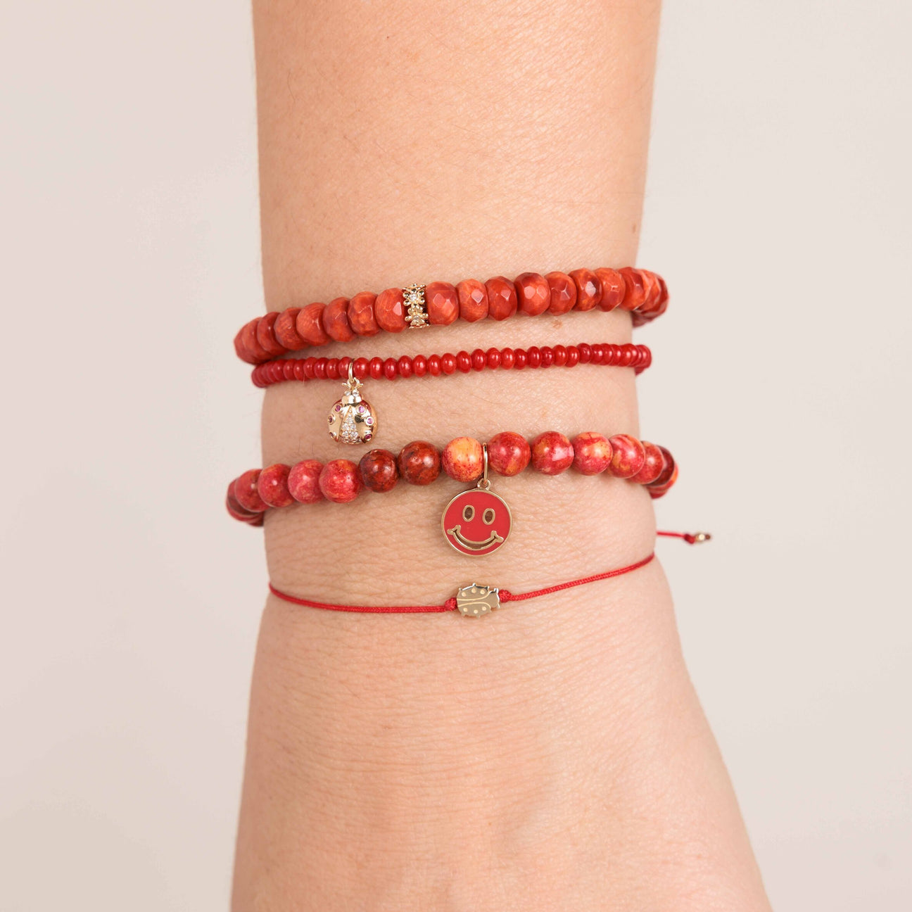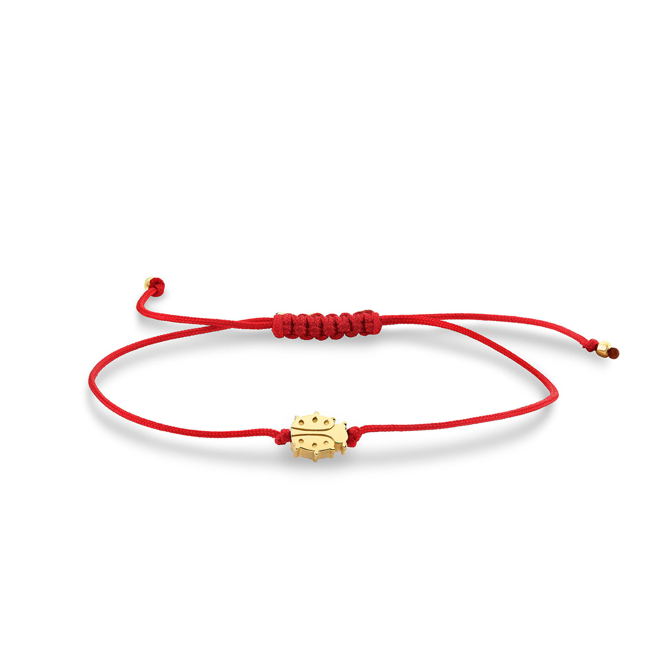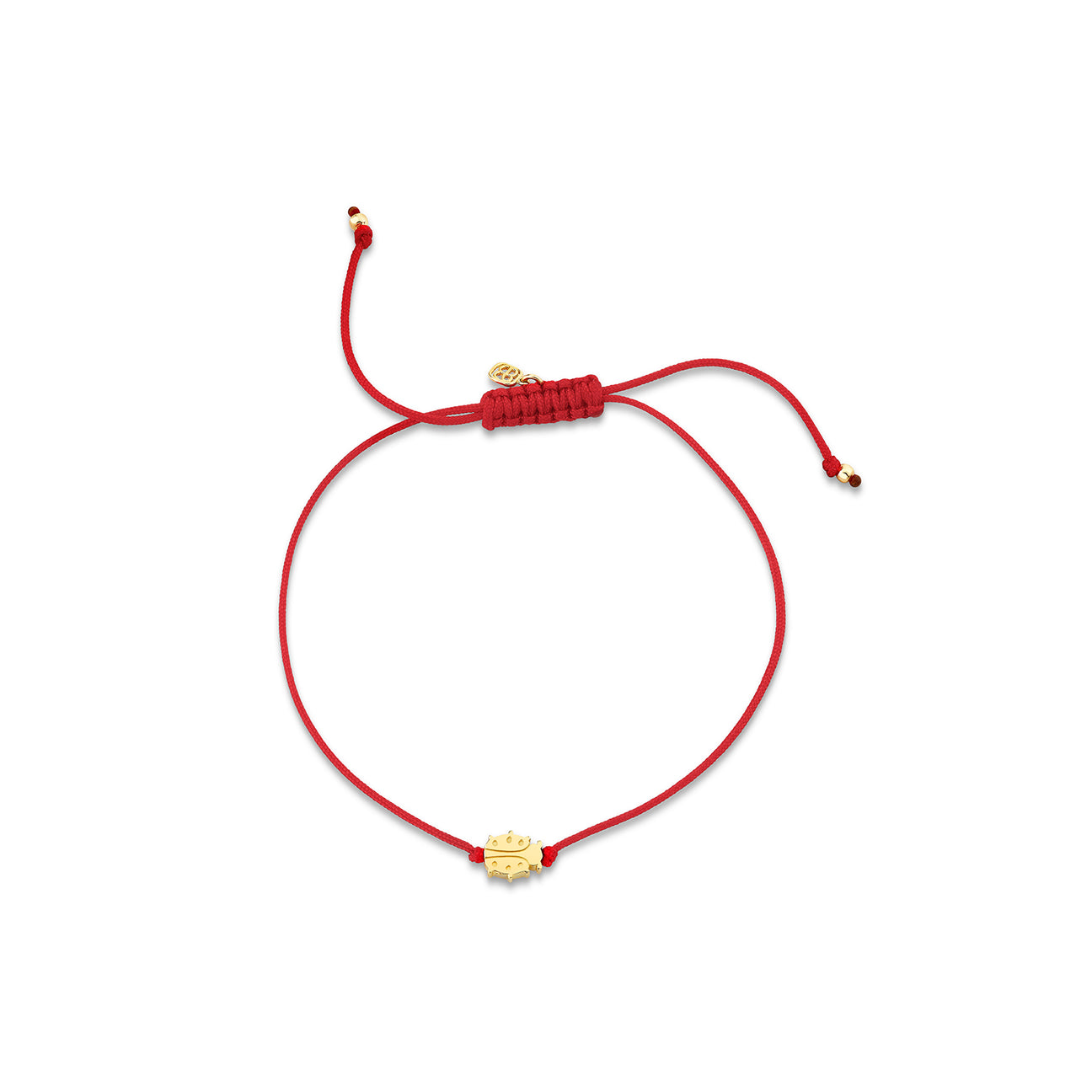 This vibrant red cord bracelet features a delicate 14k yellow gold ladybug bead charm, symbolizing good luck, protection, and the promise of happiness. The ladybug is a timeless symbol of positive energy and is often associated with bringing joy and abundance into your life. Each bracelet is strung on an adjustable silk cord, ensuring a perfect fit, and is accented with our signature 14k gold SE logo charm, representing sophistication and quality craftsmanship.